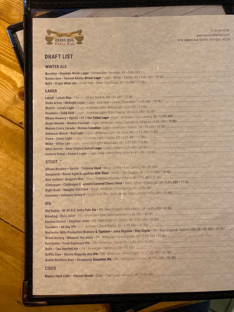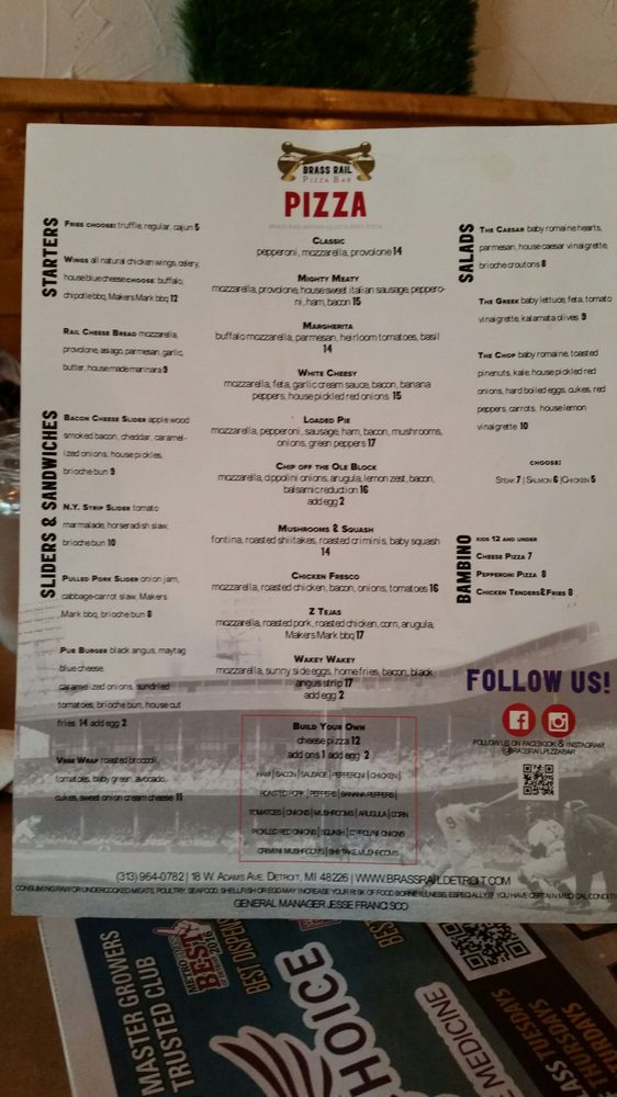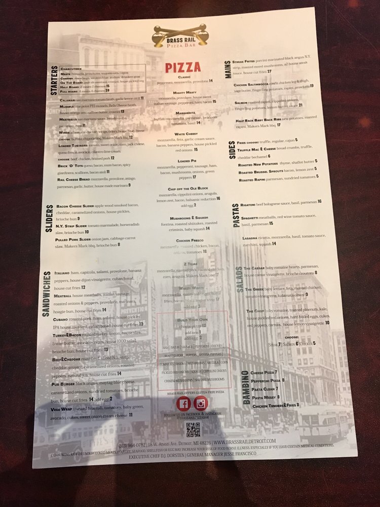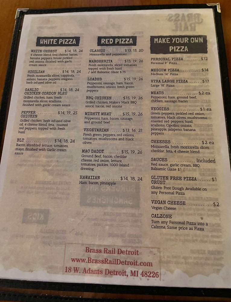 Brass Rail Pizza Bar offers a variety of appetizers like crispy wings, Rail Cheese Bread, and Bangin' Brass Shrimp. Their salads range from Greek to Caesar to Chop Salad. For those craving burgers and sandwiches, options include Classic Burger, Crispy Buffalo Chicken Sandwich, and West Coast Black Bean Burger. Customers have praised the great service, beer selection, and delicious pizza with a hint of garlic butter on the crust. The kitchen stays open late, making it a perfect spot for a late-night bite. The cozy atmosphere, outdoor seating, and proximity to venues like Little Caesars Arena make it a go-to spot for patrons attending concerts and games.Overall, Brass Rail Pizza Bar offers a diverse menu, excellent service, and a welcoming ambiance, making it a top pick for a casual dining experience in Detroit.